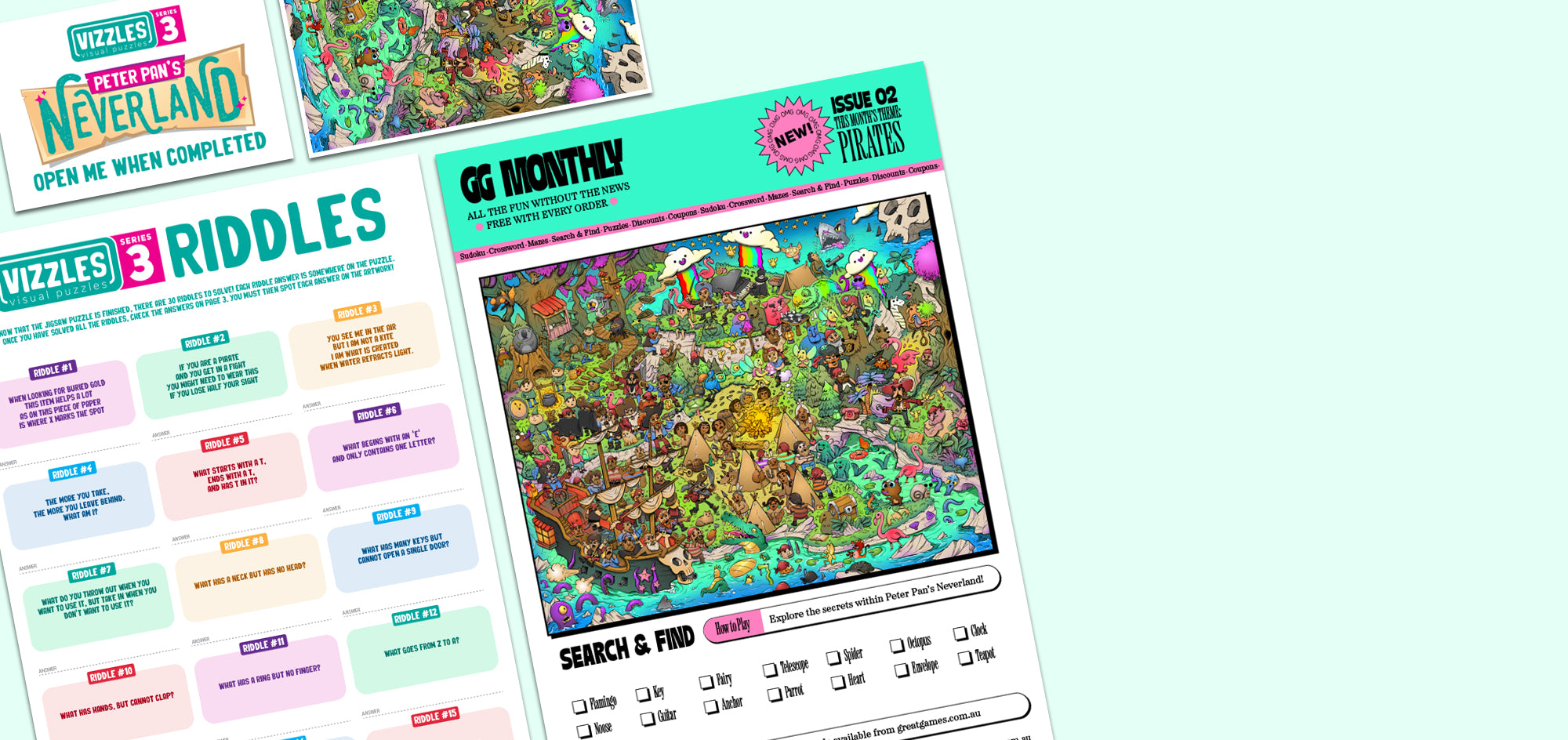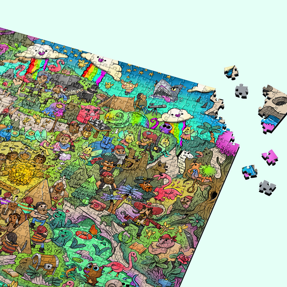 Our wondrously whimsical puzzles are illustrated by Samuel Milham, an Australian artist who creates all of the amazing products on our site. We know you'll enjoy diving into each little world that he builds with each new title.