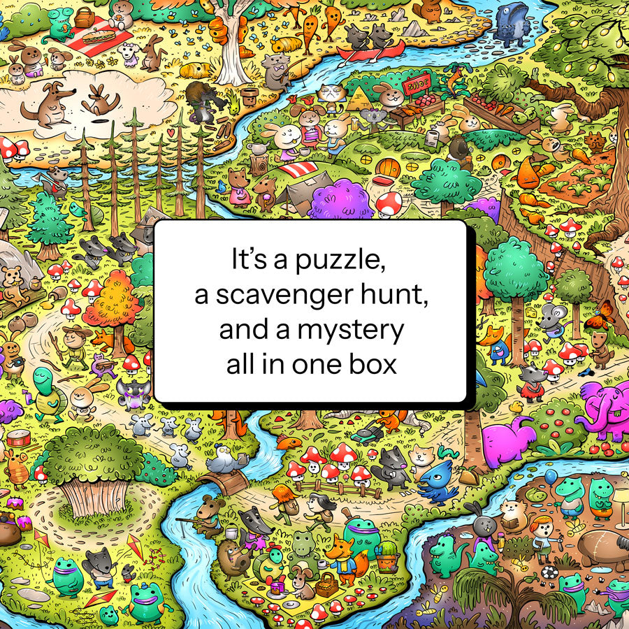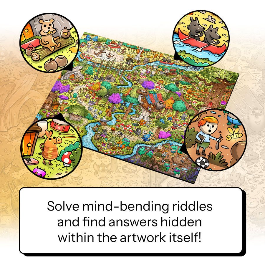 This isn’t just a jigsaw puzzle — it’s a search-and-find game wrapped inside a beautifully illustrated 1000-piece scene. Once the puzzle is complete, the journey continues: open the secret envelope and solve 30 clever riddles by spotting hidden details within the artwork.
