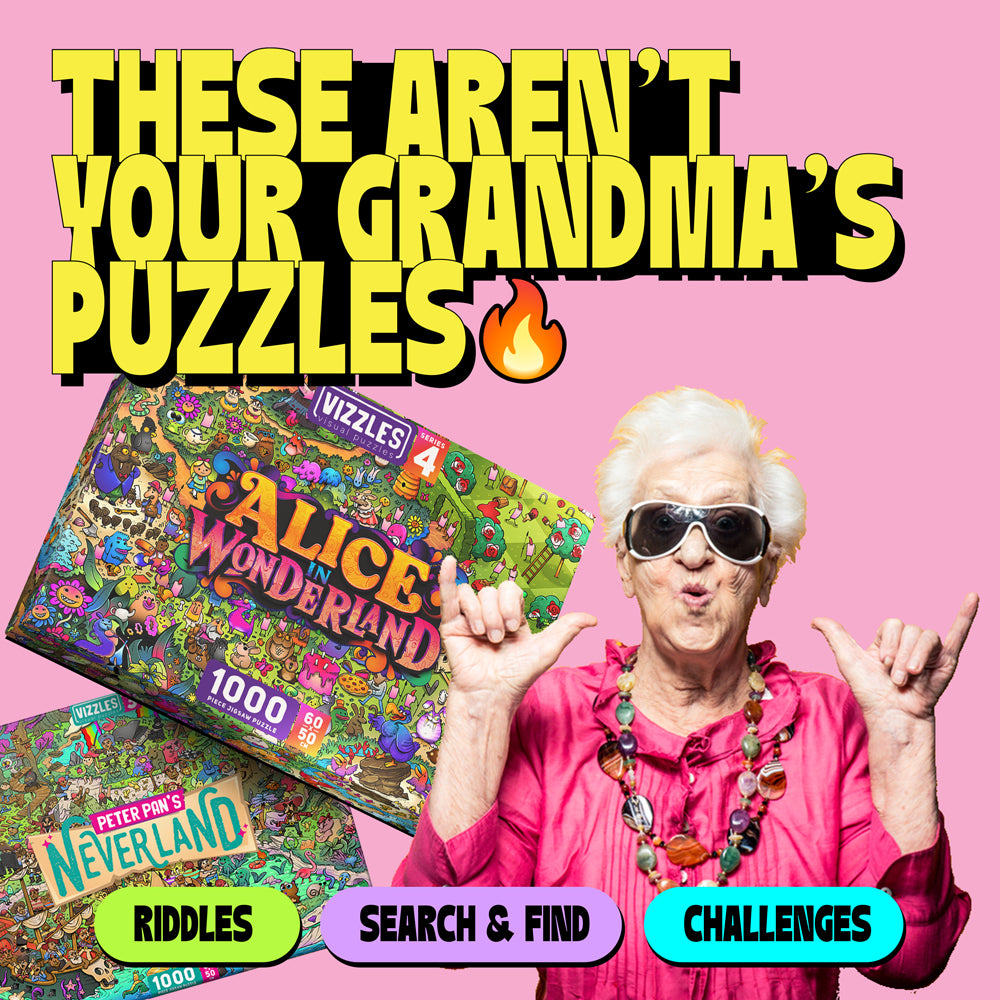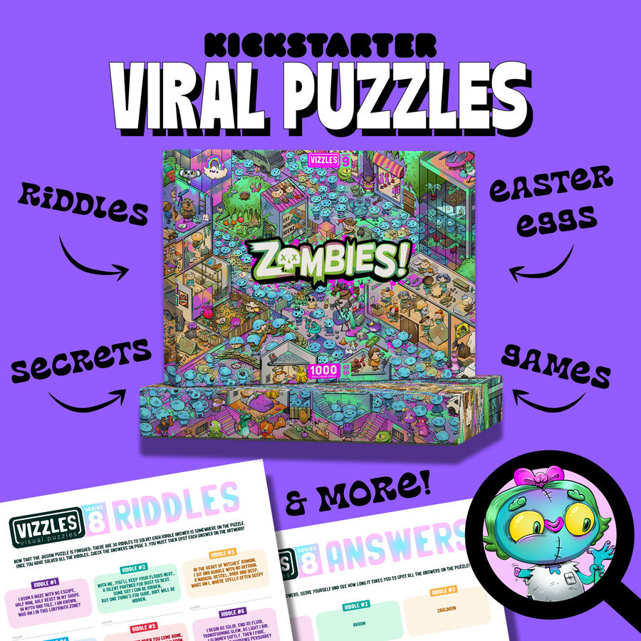 Zombies! is a 1000-piece search-and-find puzzle packed with chaotic streets, brain-hungry mobs, and plenty of secrets lurking in the shadows. Once you piece it all together, crack open the secret envelope and hunt down 30 hidden riddles buried in the artwork.